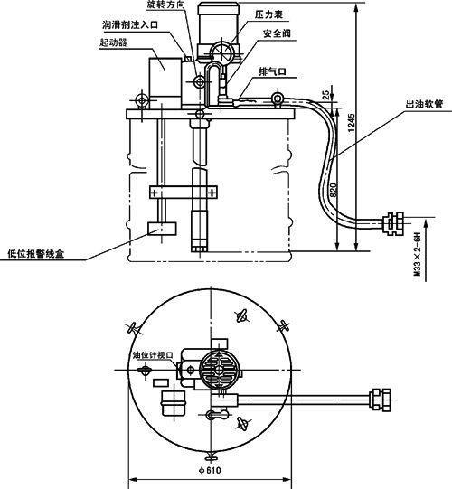 該泵適用于干油集中潤滑系統(tǒng)中,向干油潤滑裝置的貯油器內(nèi)填充潤滑脂的電動加油泵。該泵為不帶貯油桶帶桶 蓋型,直接放在 200L 油桶上,可以單獨操作,與相應的電控裝置連接可以實現(xiàn)電動潤滑泵的自動補脂。該泵為內(nèi)藏式 柱塞容積泵,采用蝸輪蝸桿減速傳動,運轉(zhuǎn)平穩(wěn),輸出壓力高,出口處設置調(diào)壓安全閥具有過載保護作用。