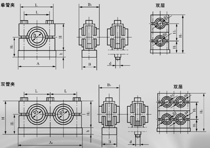 4、根據(jù)水平排列固定管子的數(shù)量不同,每種規(guī)格有兩類管夾,即單管夾和雙管夾;根據(jù)管夾與基面(支架)或機(jī) 體連接方式不同,每種規(guī)格的管夾有帶底板和不帶底板兩種。