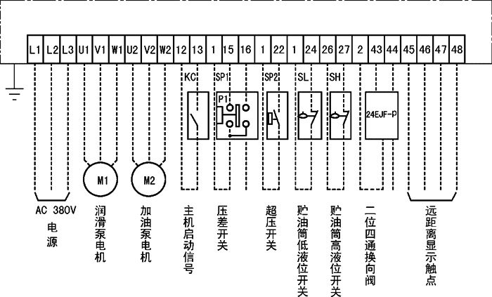 本控制箱能發(fā)出“供油時(shí)間延長”、“貯油筒空”、“超負(fù)荷運(yùn)轉(zhuǎn)”等故障信號(hào)。具有持續(xù),手動(dòng)和自動(dòng)多種控制工作狀態(tài),可通過箱面上的轉(zhuǎn)換開關(guān)來切換。持續(xù)工作狀態(tài):當(dāng)潤滑泵啟動(dòng)后持續(xù)地向系統(tǒng)兩條主管線供送潤滑脂;手動(dòng)工作狀態(tài):當(dāng)與主機(jī)聯(lián)鎖信號(hào)接通后,手動(dòng)啟動(dòng)潤滑泵運(yùn)轉(zhuǎn)向系統(tǒng)供送潤滑脂,自動(dòng)換向完成一個(gè)潤滑周期供脂后自動(dòng)停止;自動(dòng)工作狀態(tài):當(dāng)與主機(jī)聯(lián)鎖信號(hào)接通后,潤滑泵按系統(tǒng)設(shè)定的時(shí)間間隔定時(shí)向系統(tǒng)供送潤滑脂,完成一個(gè)潤滑周期后自動(dòng)停止。潤滑泵不管在何種狀態(tài),一旦貯油筒空,補(bǔ)脂泵就會(huì)自動(dòng)啟動(dòng)補(bǔ)脂,補(bǔ)滿后自動(dòng)停止。