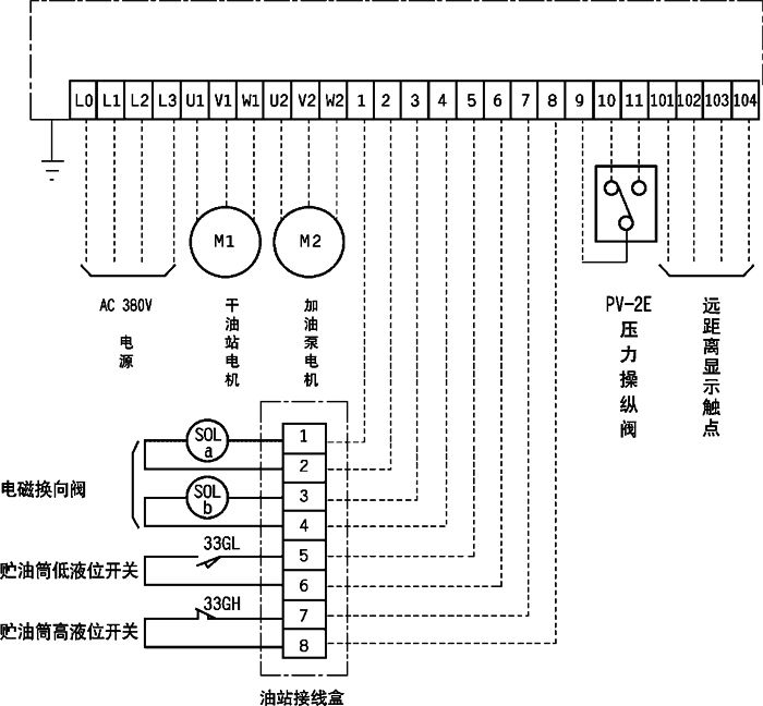 控制箱能發(fā)出“供油時間延長”、“油箱液位低”、“超負載運轉(zhuǎn)”等故障信號。箱內(nèi)設有一組外部接點,可向主機或主控室發(fā)送系統(tǒng)運轉(zhuǎn)狀況(停止、運轉(zhuǎn)、故障)信號。