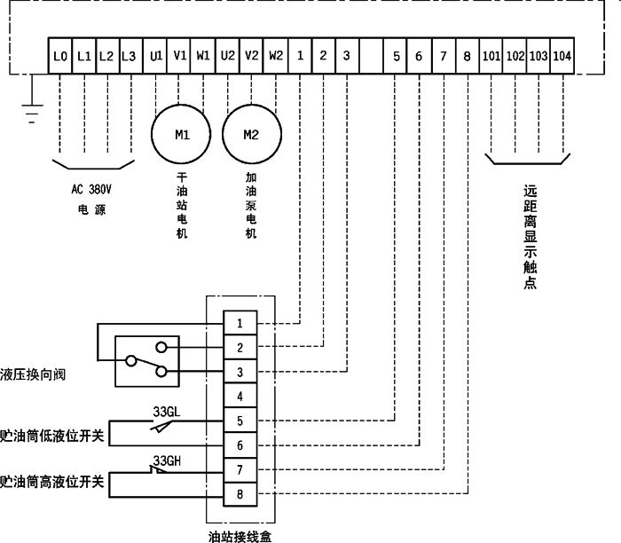 控制箱能發(fā)出“供油時(shí)間延長”、“加油泵超載”、“超負(fù)載運(yùn)轉(zhuǎn)”等故障信號(hào)。箱內(nèi)設(shè)有一組外部接點(diǎn),可向主機(jī)或主控室發(fā)送系統(tǒng)運(yùn)轉(zhuǎn)狀況(停止、運(yùn)轉(zhuǎn)、故障)信號(hào)。