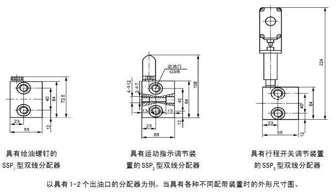 2、雙線分配器在系統(tǒng)中優(yōu)先采用并聯(lián)安裝法,供油管與分配器在左邊或右邊聯(lián)接均可;其次采用串聯(lián)安裝法,須把一側(cè)進(jìn)油口上起封閉管道的二個(gè)G3/8螺塞卸掉,最多串接數(shù)不允許超過二個(gè);必要時(shí)可并串組合安裝。