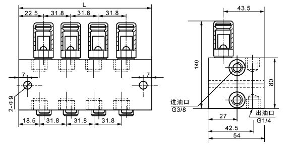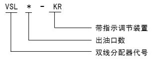 VSL-KR型雙線分配器上下面均有給油口,分配器活塞正反向動作時分別從上面和下面的給油口排出潤滑脂;在相應(yīng)上、下給油口內(nèi)設(shè)有合二為一的排油結(jié)構(gòu),要改變奇數(shù)出油,只需將孔內(nèi)的螺釘擰出即可。還可以從指示桿的動作直接觀察分配器的工作情況,同時還可以通過調(diào)整螺釘在規(guī)定范圍內(nèi)調(diào)整各出油口的給油量。