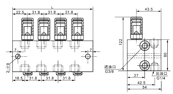 若需相應(yīng)上下出口合并時,只要將孔內(nèi)的螺釘擰出,把上或下不用的那個出油口用 G1/4 螺塞封堵以防灰塵侵入。