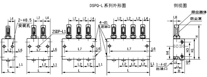DSPQ-L系列單向出油的雙線分配器,只在下面有出油口,活塞正向、反向排油時(shí)都由下出油口供送潤(rùn)滑脂。其形式與尺寸見(jiàn)圖和表的規(guī)定。