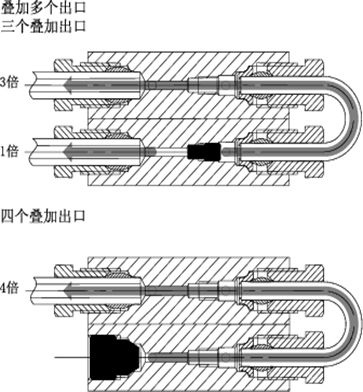 為滿足大油量潤(rùn)滑點(diǎn)的潤(rùn)滑需要,遞進(jìn)式分配器需要疊加兩個(gè)或兩個(gè)以上的出口。