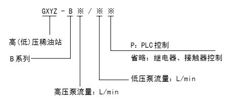 如采用 B 系列,高壓流量為 20L/min;高壓壓力為 31.5MPa,低壓供油壓力為 0.4MPa;而低壓供油量為 100L/min 的高(低)壓稀油站,采用繼電器、接觸器控制的則按如下方法標注:GXYZ-B20/100