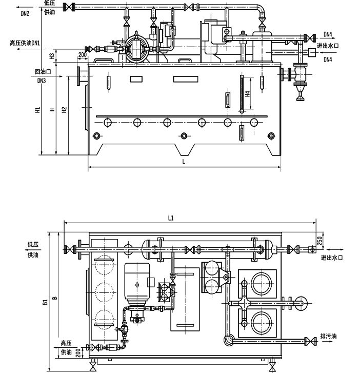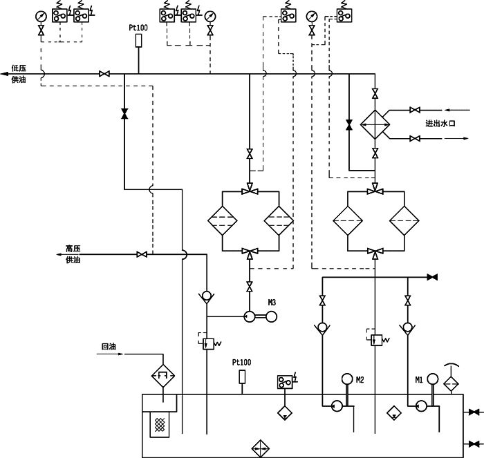 本油站為整體式,由油箱、兩臺低壓油泵、一臺高壓油泵、二臺雙筒網(wǎng)片式過濾器、回油磁網(wǎng)過濾裝置、列管式 油冷卻器、各種控制閥門、管道以及電接點壓力表、鉑熱電阻等組成。