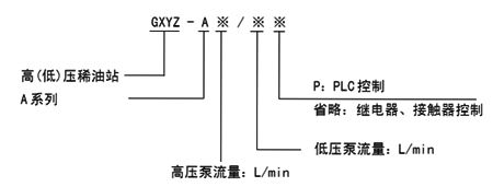 如采用 A 系列,高壓流量為 2.5L/min;高壓壓力為 31.5MPa,低壓供油壓力為 0.4MPa;而低壓供油量為 40L/min 的高(低)壓稀油站,采用 PLC 控制的則按如下方法標(biāo)注:GXYZ-A2.5/40.