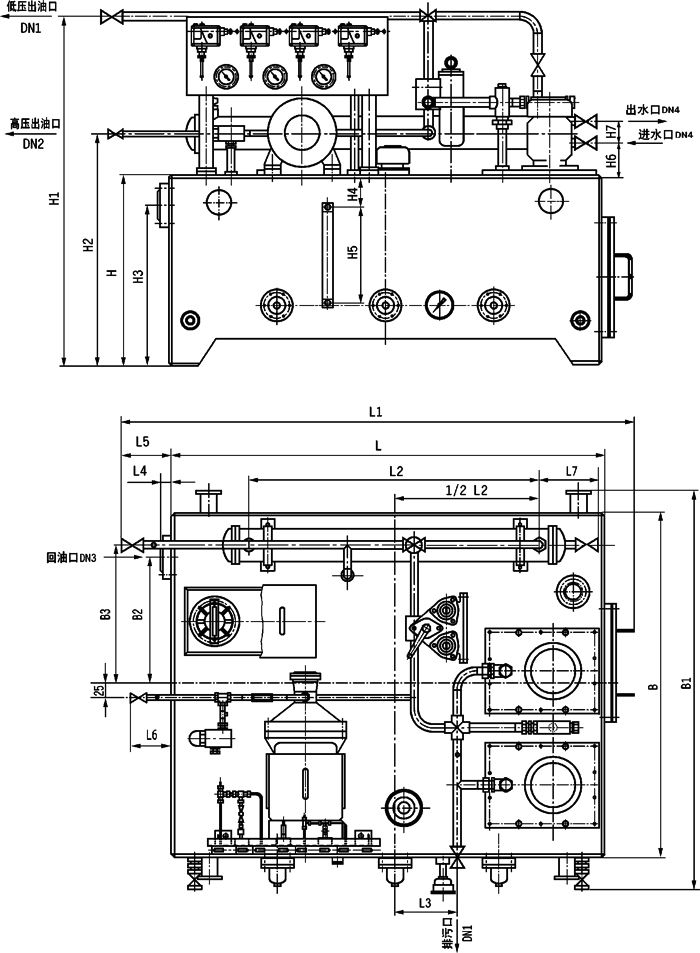 本產(chǎn)品主要由油箱(其內(nèi)裝有磁網(wǎng)過濾器)、低壓油泵裝置、高壓油泵裝置、雙筒網(wǎng)片式過濾器、冷卻器、管道、閥 門、儀表盤及電控柜等組成。