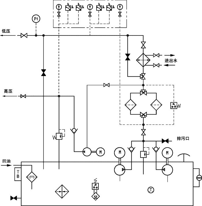 根據(jù)動靜壓潤滑工作原理,在啟動、低速和停車時用高壓系統(tǒng),正常運(yùn)行時用低壓系統(tǒng),以保證大型機(jī)械在各種 不同轉(zhuǎn)速運(yùn)行下均能獲得可靠的潤滑以延長主機(jī)壽命。