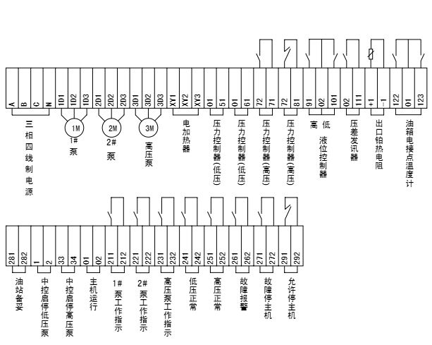 油箱上裝有電接點(diǎn)雙金屬溫度計,油溫低時發(fā)出信號,人工接通電加熱器,達(dá)到設(shè)定溫度時,自動切斷電加熱器。
