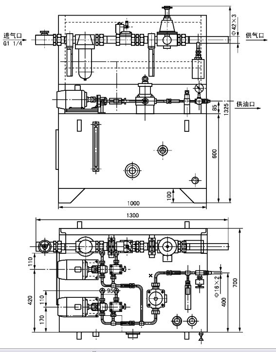 空氣操作盤主要由過濾器、減壓閥等空氣處理元件組成, 其作用是將一定壓力的空氣輸入到油氣混合塊。