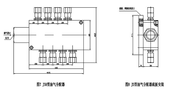 2 JS型油氣分配器的型式與尺寸應(yīng)符合圖1~圖8和表2的規(guī)定。