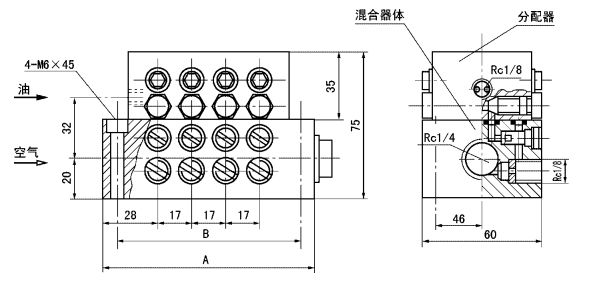 遞進式油氣混合器由一個分配器(上)和一個混合器體(下)組成,分配器把輸入的油分成若干部分輸進混合器體,通過不間斷的壓縮空氣將油送入到潤滑點。根據(jù)出油口數(shù)分為 5 種規(guī)格。這種油氣混合器適用于遞進式和保壓式兩種系統(tǒng)。