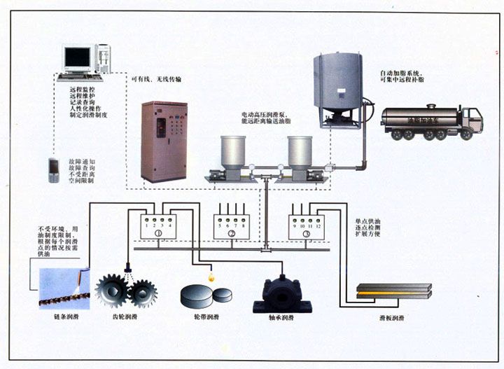 1、環(huán)境惡劣人工不易加油的潤滑點,遠距離的輸送和不易密封的設備;